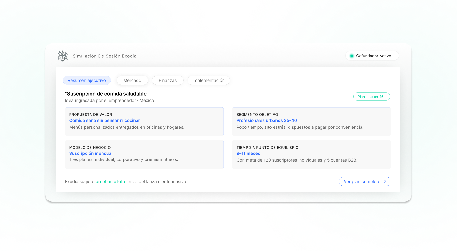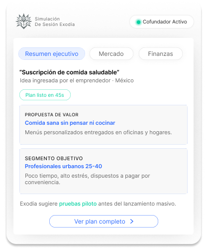 No necesitas saber de estrategia, finanzas o marketing. Solo necesitas tu idea. Exodia se encarga del resto.